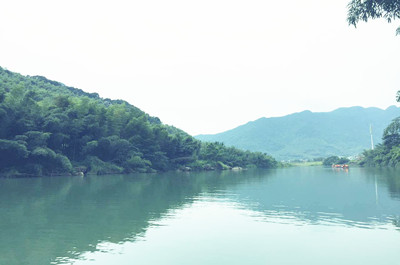 溪水清澈见底,艄公手执一柄竹蒿站在竹筏前方,驶过平静的湖面,岸边绿树相称,让一切都是那样的恬静自然。