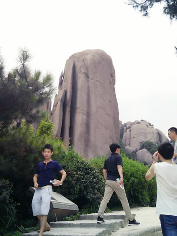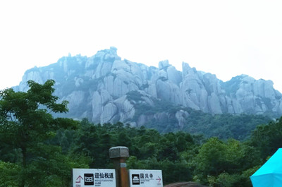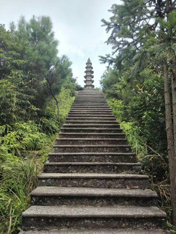 当天太姥山的天气还是很适宜爬山的,多云遮盖了些许直射的日光,再加上山上的葱葱郁郁的树木,为大家的行程增添了几分清爽。沿着曲折的石阶,我们途径了一座千年古塔再往前行又途径一座千年古寺的遗址,据说这座古寺完全靠石材间的相互助力砌合而成,虽然古寺被焚毁如今只剩几根石柱,但置身于此依然能够为前人的技艺所震撼。
