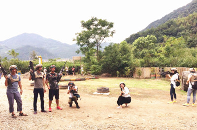 就在我们陶醉于青山绿水中,竹排缓缓靠了岸。上岸后的活动与之前悠然的漂流相比略显动感,我们展开了激烈的CS对战。